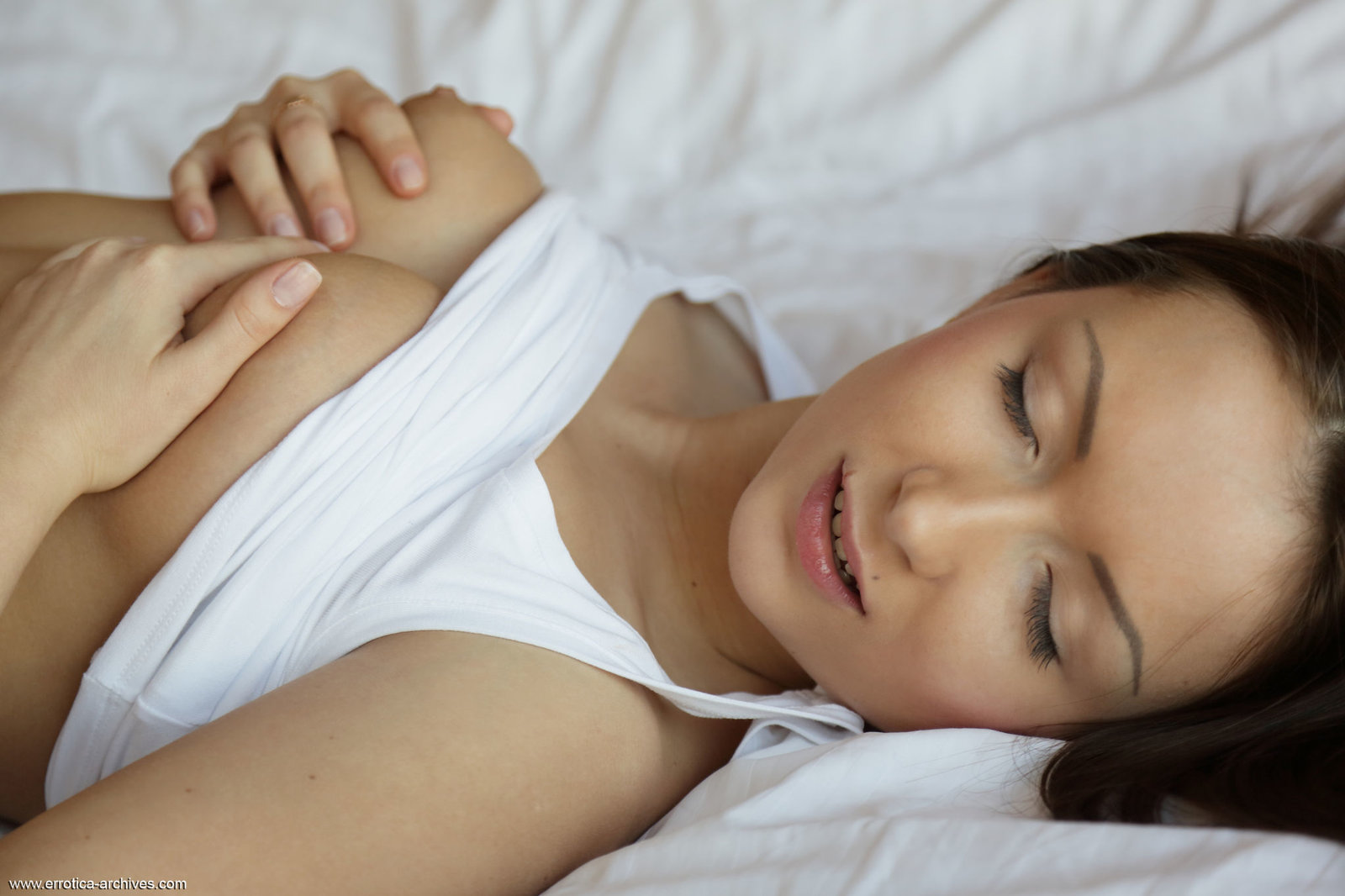 Zgrabna i młoda niunia ma boskie cycuszki, które prezentuje w sypialni. Laseczka rozkłada delikatnie swe nóżki i pieści swą szparę przez majteczki. Gorąca ślicznotka leży na plecach i delikatnie ściska swe cudowne sutki. Śliczna panienka ma boskie uda.