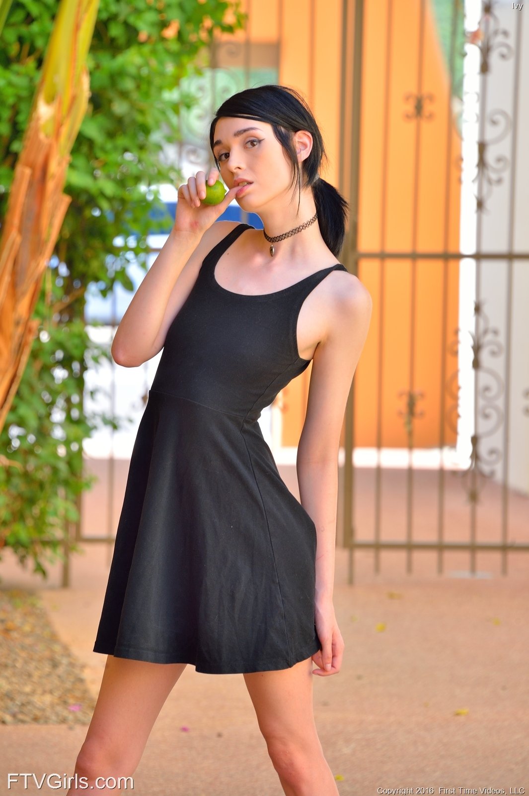 Mała dziewczyna w czarnej sukience siada na publicznych schodach i wciska w swą boską muszelkę cytrusy. Świetna ślicznotka ma różową piczkę i piękne oczka. Kusząca dziewczyna kocha dogadzać sobie w publicznych miejscach.