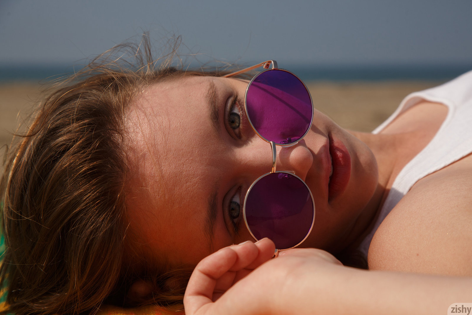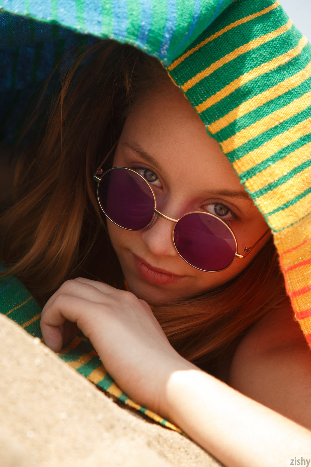 Mega seksowna laseczka prezentuje swe niewielkie piersi na plaży nad oceanem. Seksowna laseczka kładzie się zupełnie nago na rozgrzanym piasku. Laseczka zakrywa swe nagie ciałko kocykiem. Świetna niunia pokazuje swe różowe sutki.