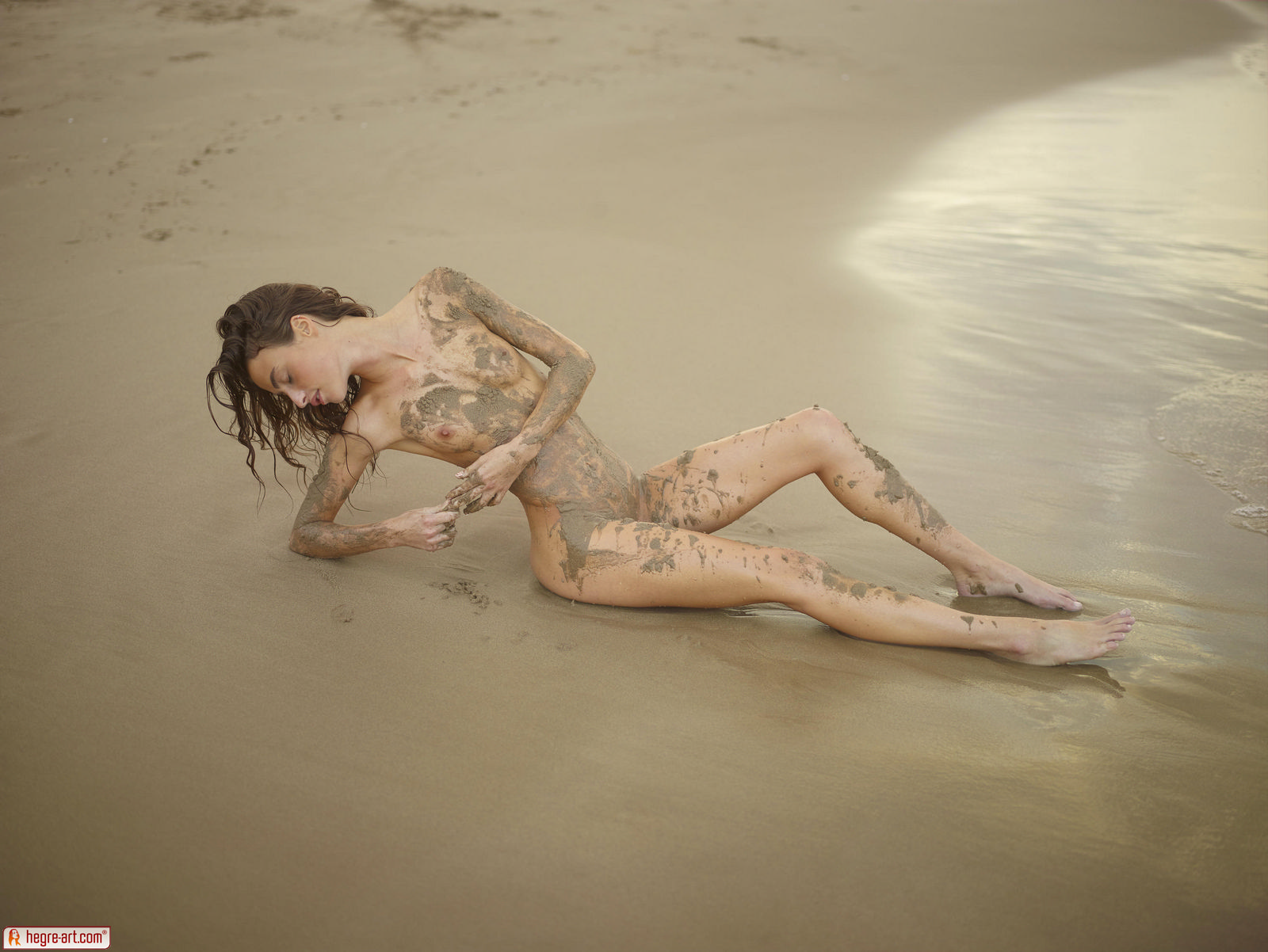 Naga niunia prezentuje swe boskie ciałko w piasku na plaży. Przecudowna laseczka ma słodkie oczka i ładne niewielkie piersi. Idealna babeczka klęczy na plaży i pokazuje na co ją stać. Świetna laska jest wspaniale zgrabna i seksowna.