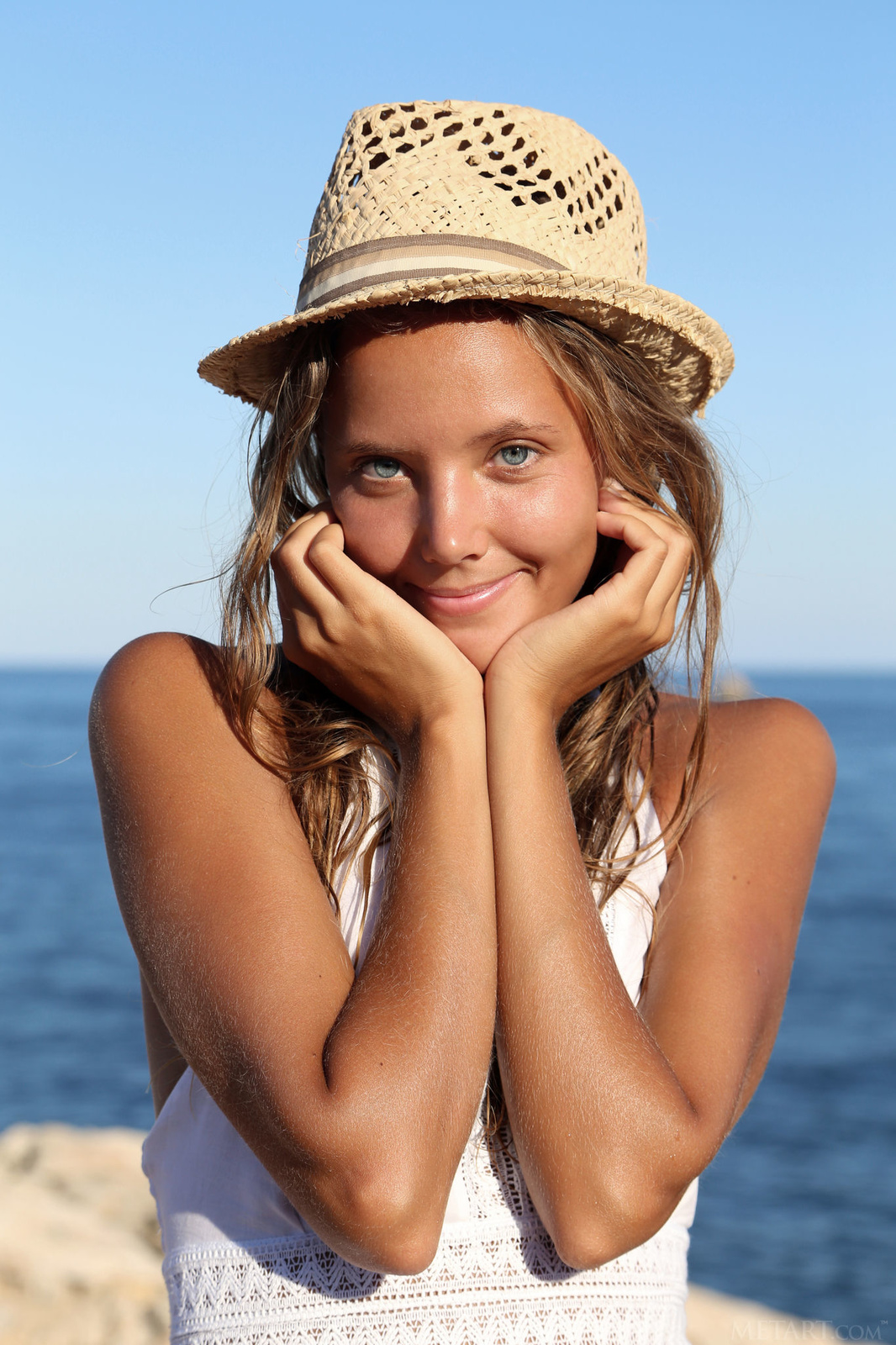 Bardzo blondyneczka ma na sobie jedynie słomiany kapelusz. Fajna dziewczyna prezentuje swoje ciałko na plaży w słoneczny dzieĹ. Niebieskooka młoda laseczka prezentuje swe ciałko idealnie. Świetna seks laseczka ma świetne ciałko.