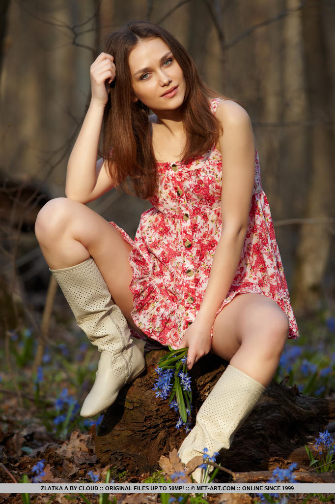 Bardzo fajna ruda dziewczyna dotyka się delikatnie po swoim ciele w lesie. Niesamowita dziewczyna ma boskie ciałko, zgrabne i smukłe. Dziewczyna zdejmuje sukienkę ze swojego ciałka i prezentuje się zupełnie nago. Boska kobietka ma fajne, niewielkie cycuszki.