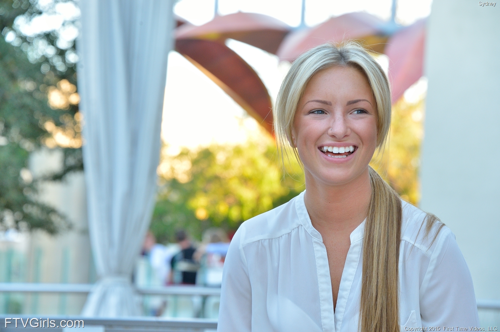 Cudowna seks blondynka zdejmuje spodenki i pokazuje swoją dupkę oraz kawałek swej kuszącej cipki. Dziewczyna siada na ławeczce i prezentuje swe zgrabne nóżki. Laseczka nie ma staniczka, a jej sutki przebijają przez białą koszulę.